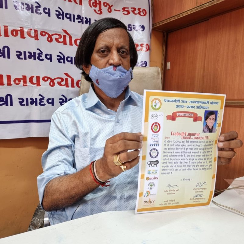 પ્રધાનમંત્રી જન કલ્યાણકારી યોજના પ્રચાર-પ્રસાર અભિયાન દ્વારા માનવજ્યોતનાં પ્રબોધ મુનવરની વિવિધ સેવાકીય પ્રવૃત્તિઓની નોંધ લઇ સન્માનપત્ર અર્પણ કરવામાં આવ્યું છે. રાષ્ટ્રીય અધ્યક્ષ શ્રી મુકેશ શર્મા, રાષ્ટ્રીય મહામંત્રી શ્રી જયકરણ ડબ્બાસ, ગુજરાત પ્રદેશ પ્રભારી સાધ્વી નિર્મલાજીનાં માર્ગદર્શન હેઠળ રાષ્ટ્રીય સચિવ શ્રીમતિ આશિકાબેન ભટ્ટે સન્માનપત્ર અર્પણ કરી શુભેચ્છાઓ પાઠવી હતી. ભુજ અને કચ્છમાં વિવિધ સેવાકીય પ્રવૃત્તિઓ સાથે […]